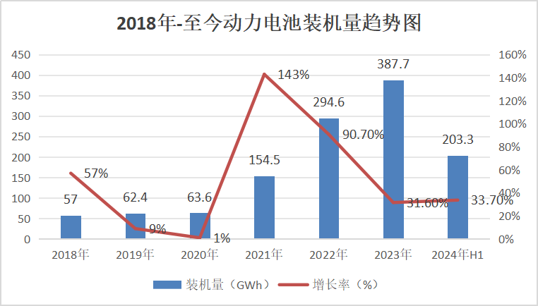 2024年上半年我国动力电池累计装车量203.3GWh, 同比增长33.7%。其中三元电池累计装车量62.3GWh,占总装车量30.6%;磷酸铁锂电池装车量141.0GWh,占总装车量69.3%。
