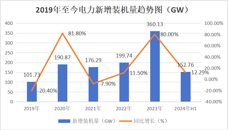 截至2024年6月底,全国累计发电装机容量约为30.7亿千瓦,较去年同期增长了14.1%。2024年上半年新增发电装机容量为152.76GW,同比增长12.29%。