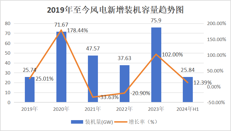 2024年1-6月,新增风电装机容量25.84GW,同比增长12.40%。累计并网装机容量466.71GW,占电源总装机比例15.19%。