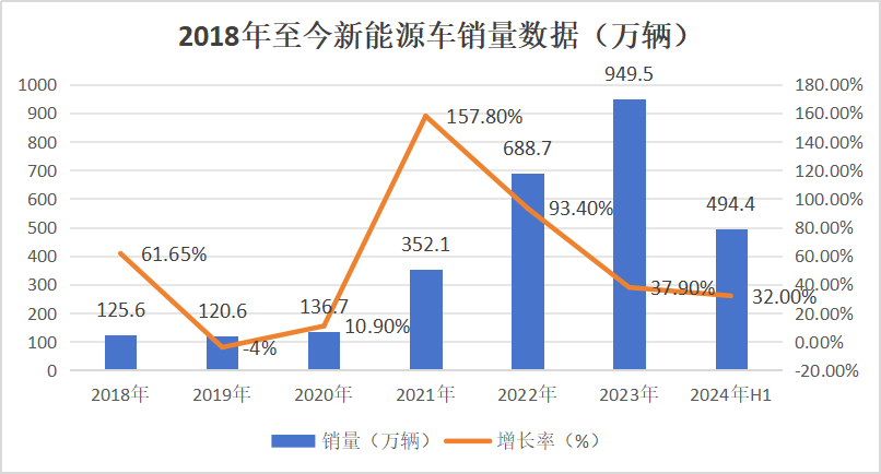 2024年1—6月,新能源汽车产销分别完成492.9万辆和494.4万辆,同比分别增长30.1%和32%。新能源汽车国内销量433.9万辆,同比增长35.1%。新能源汽车出口60.5万辆,同比增长13.2%。