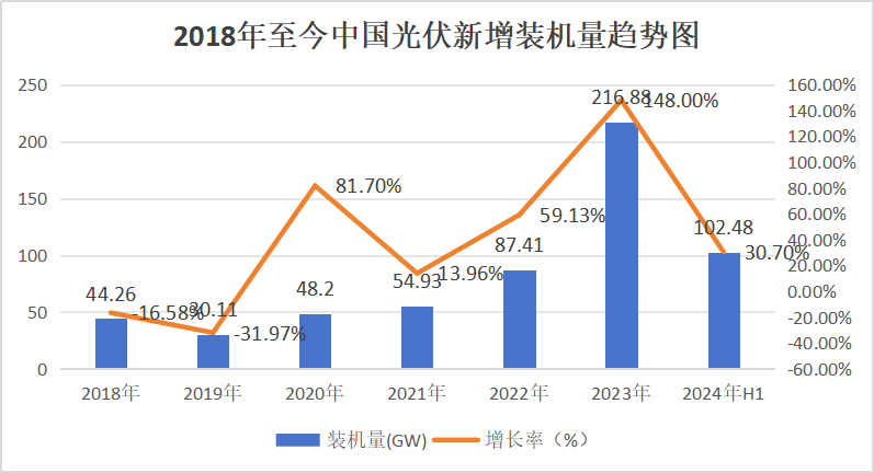 2024年上半年,光伏新增装机达到了102.48GW,同比增长30.7%。其中,集中式光伏新增装机为49.6GW,工商业新增装机为37.03GW,户用光伏新增装机为15.85GW。